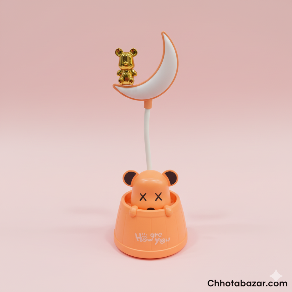 Make bedtime fun and cozy with our Bear Moon Night Lamp, featuring a cute bear peeking from its base and a golden bear sitting on a crescent moon!
